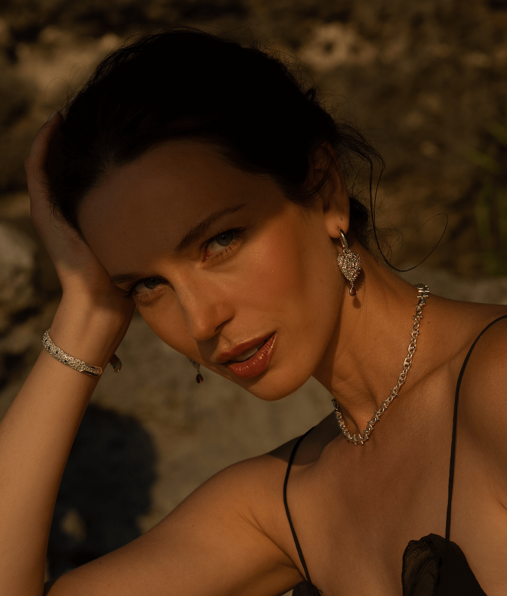sterling silver, using rhodium and vermeil platings and precious stones and pearls.